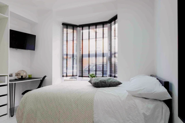 ベッドルームにはダブルベッドがあり、大型のビルトインクローゼットで収納スペースが豊富です。デスクチェアと32インチのフラットスクリーンスマートTVを備えた作業スペースもあります。私たちには優れたメンテナンスチームがあり、通常は報告された同日に物件の問題に対処できます(あなたが問題を抱えることはないと思いますが!)。学生の安全を最も重要視しているため、すべての家には安全な複合材の前扉と後扉、侵入者警報が装備されています。